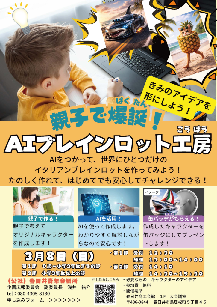 3月事業 募集要項 「親子で爆誕!AIブレインロット工房」を開催します❗本事業では、親子で考えたアイデアをもとに、AIを活用して世界にひとつだけのオリジナルキャラクターを制作する体験を提供します🤖✨親子でアイデアを出し合い、... -