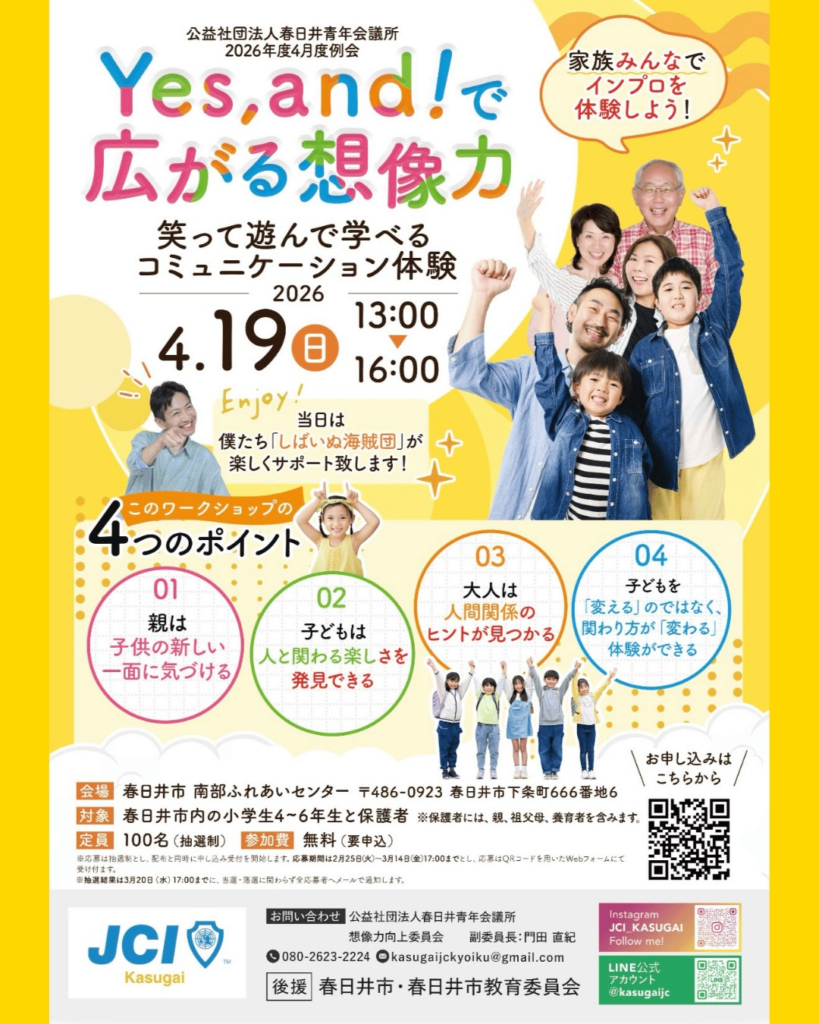 4月度例会 募集要項 🎭✨ Yes,and!で広がる想像力親子で参加!笑って遊んで学べるコミュニケーション体験!親子で一緒にチャレンジして、世界が広がる“インプロ(即興劇)体験ワークショップ” 🎉台本なし!すべて即興!「Yes,and!」... -